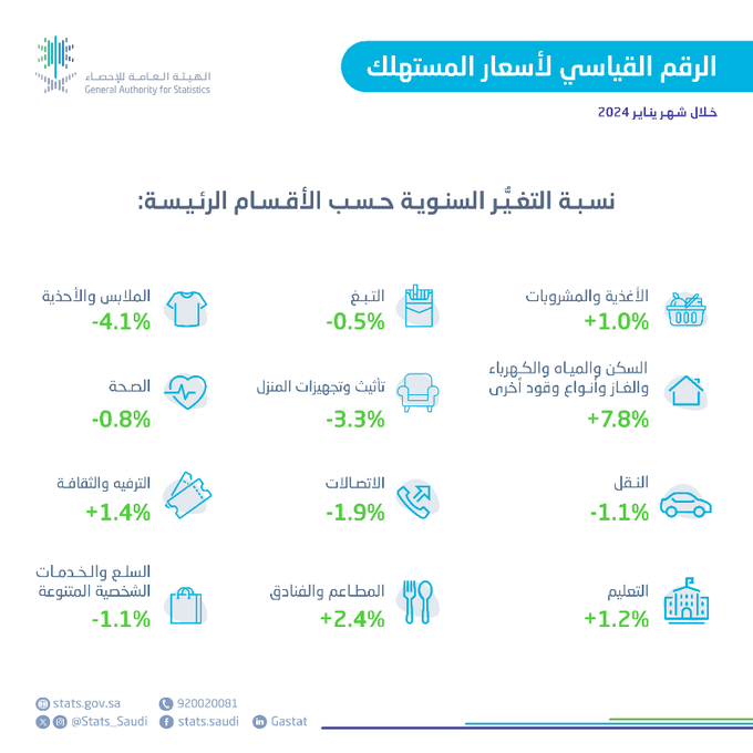 وعلى أساس شهري، سجل مؤشر أسعار المستهلك في المملكة ارتفاعاً طفيفاً بلغت نسبته 0.3% خلال شهر يناير / كانون الثاني 2024 ، مقارنة بالشهر السابق.