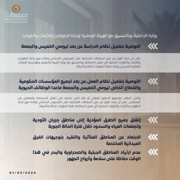 وبناءً على الحالة الجوية المتوقعة، أوصت وزارة الداخلية بالتنسيق مع الهيئة الوطنية لإدارة الطوارئ والأزمات والكوارث بتفعيل نظام الدراسة عن بعد ليومي الخميس والجمعة لجميع المؤسسات التعليمية.