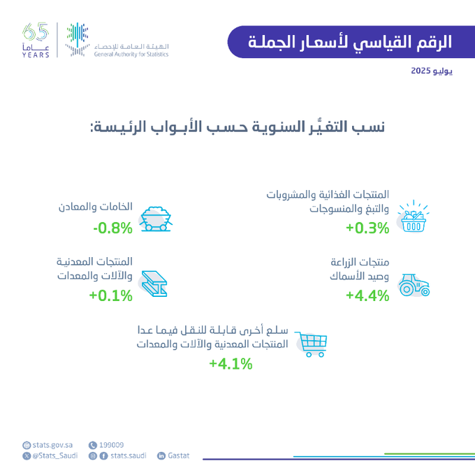 الرياض – مباشر: سجل الرقم القياسي لأسعار الجملة في المملكة العربية السعودية ارتفاعاً بنسبة 2.1% خلال شهر يوليو 2025، مقارنة بالشهر نفسه من العام الماضي، لارتفاع أسعار السلع الأخرى القابلة للنقل ومنتجات الزراعة وصيد الأسماك.