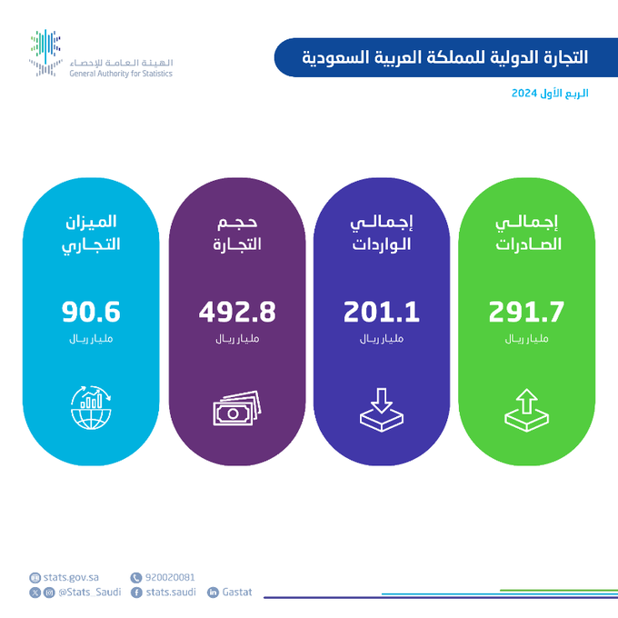 وعلى صعيد الواردات فقد ارتفعت في الربع الأول للعام 2024 بنسبة 6.4%، لتصل إلى 201 مليار ريال، مقابل 189 مليار ريال في الربع المقارن للعام الماضي، فيما تراجعت الواردات بنحو طفيف بالمقارنة على أساس ربع سنوي، حيث بلغت في الربع الرابع من 2023 نحو 202 مليار ريال.