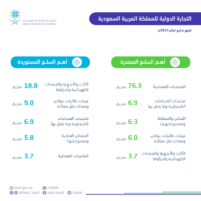 وتعد "منتجات الصناعات الكيماوية من أهم سلع الصادرات غير البترولية حيث شكلت 23.8 % من إجمالي الصادرات غير البترولية، وقد انخفضت بالمقارنة مع شهر مايو 2023م بنسبة 66.2 % تليها اللدائن والمطاط ومصنوعاتهما" (تمثل 21.8% من إجمالي الصادرات غير البترولية)، وانخفضت اللدائن والمطاط بنسبة 63.4% في مايو الماضي، مقارنة بشهر مايو 2023م.