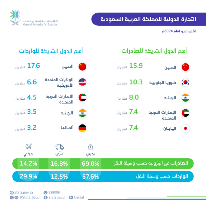 وتعتبر الصين الوجهة الرئيسة لصادرات المملكة والتي شكلت ما نسبته 15.2% من إجمالي الصادرات في شهر مايو 2024م، تليها كوريا الجنوبية بنسبة 9.8% من إجمالي الصادرات) ثم الهند (بنسبة 7.7% من إجمالي الصادرات).