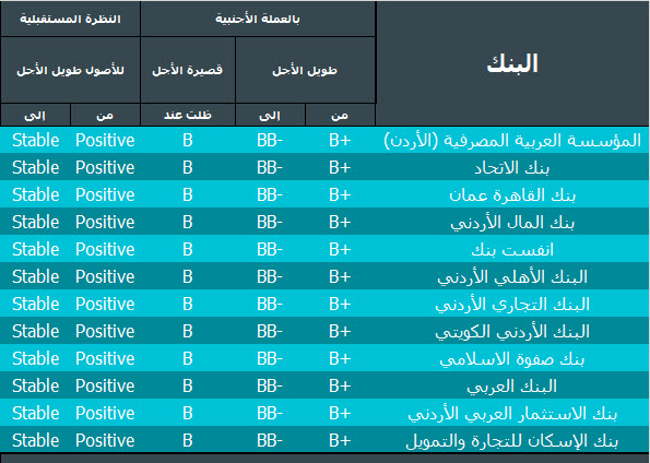 وجاءت تلك إجراءات التصنيف مدفوعة بالترقية الأخيرة للتصنيف الائتماني لمصدري الأوراق المالية السياديين في الأردن، حيث رفعت تصنيفها للأصول السيادية طويلة الأجل من "+B" إلى "-BB"، وحسنت معيار مخاطر بيئة التشغيل للنظام المصرفي من "-BB" إلى "-bb".