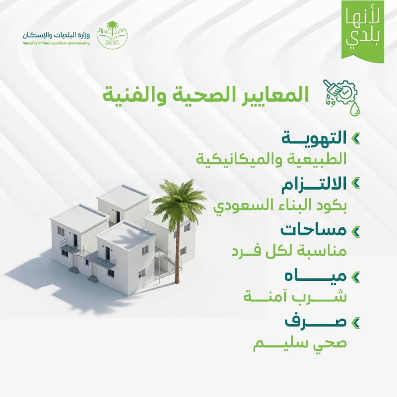 الرياض - مباشر: أطلقت وزارة البلديات والإسكان النسخة المحدثة لدليل الشروط الصحية والفنية والسلامة في المساكن الجماعية للأفراد، في إطار جهودها لتنظيم هذا النوع من المساكن وتوحيد ضوابطها، بما يُسهم في توفير بيئة سكنية آمنة وصحية، في مدن المملكة.