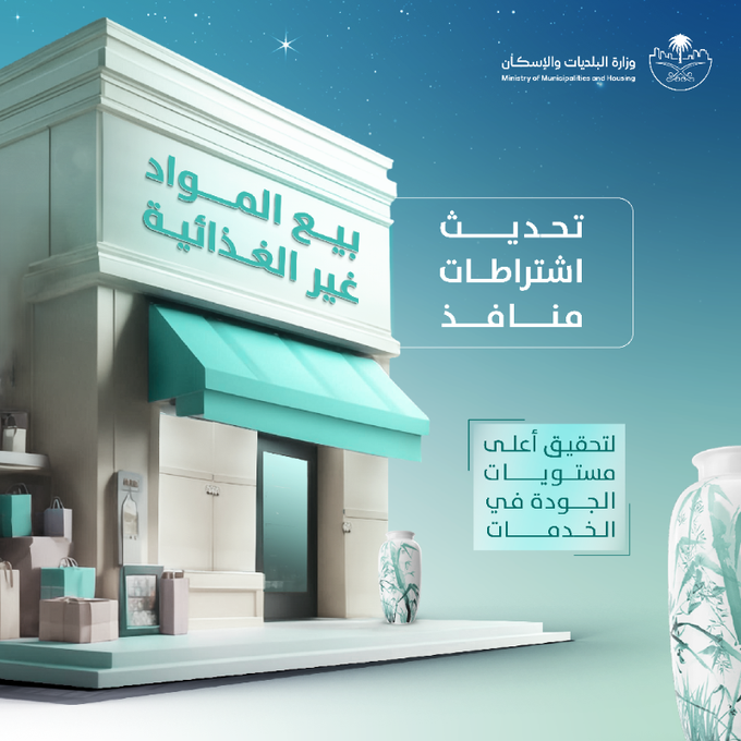 الرياض - مباشر: أعلنت وزارة البلديات والإسكان، تحديث اشتراطات منافذ بيع المواد غير الغذائية؛ وذلك في إطار جهودها المستمرة لمعالجة مظاهر التشوه البصري، وتعزيز الامتثال للاشتراطات البلدية، وتنظيم بيئة الأعمال التجارية.