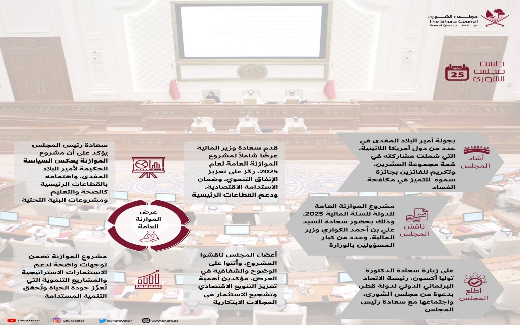 الدوحة – مباشر: ناقش مجلس الشورى القطري برئاسة حسن الغانم مشروع الموازنة العامة للدولة للسنة المالية 2025، بحضور علي الكواري وزير المالية، وعدد من كبار المسؤولين بالوزارة.