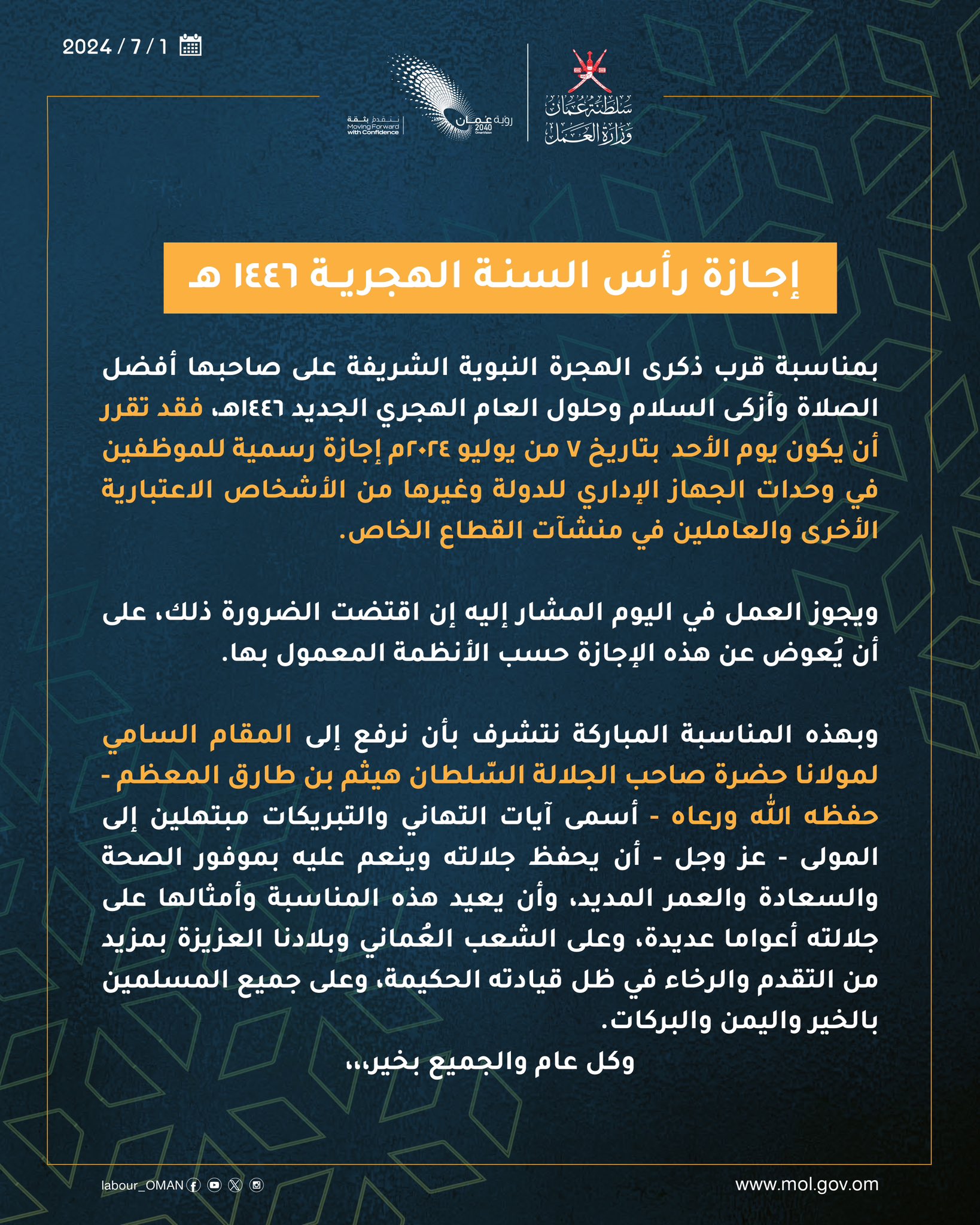 مباشر: حددت وزارة القوى العاملة العُمانية يوم الأحد القادم 7 يوليو / تموز الجاري، كعطلة للعاملين بشركات ومؤسسات ومنشآت القطاع الخاص، بمناسبة ذكرى الهجرة النبوية الشريفة.