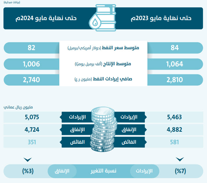 مباشر: حققت عُمان فائض مالي في ميزانيتها العامة بنهاية شهر 5 أشهر من العام الجاري 2024، بقيمة 351 مليون ريال، بتراجع 39.59 بالمائة على أساس سنوي، ومقابل فائض مالي قدره 581 مليار ريال في 5 أشهر من العام الماضي.