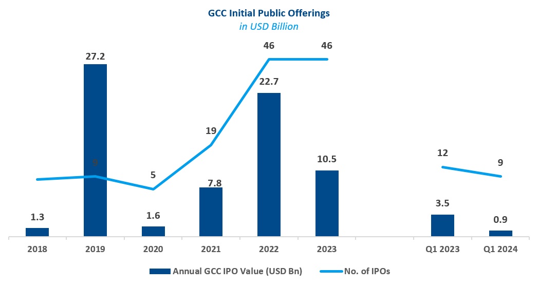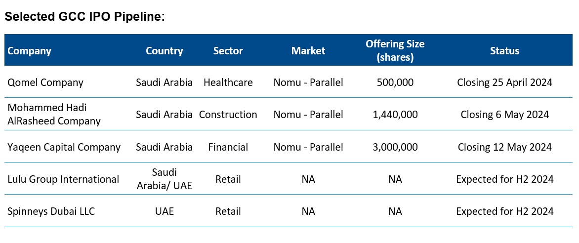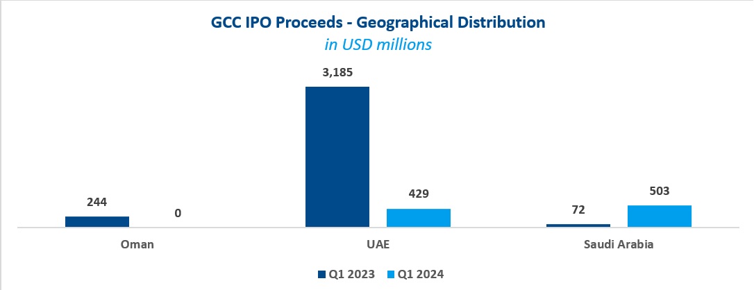 Saudi Arabia led the region in the three-month period that ended on 31 March 2024, raising total proceeds of $503 million from eight offerings, a 594% YoY surge from Q1-23, constituting 54% of the region's total.