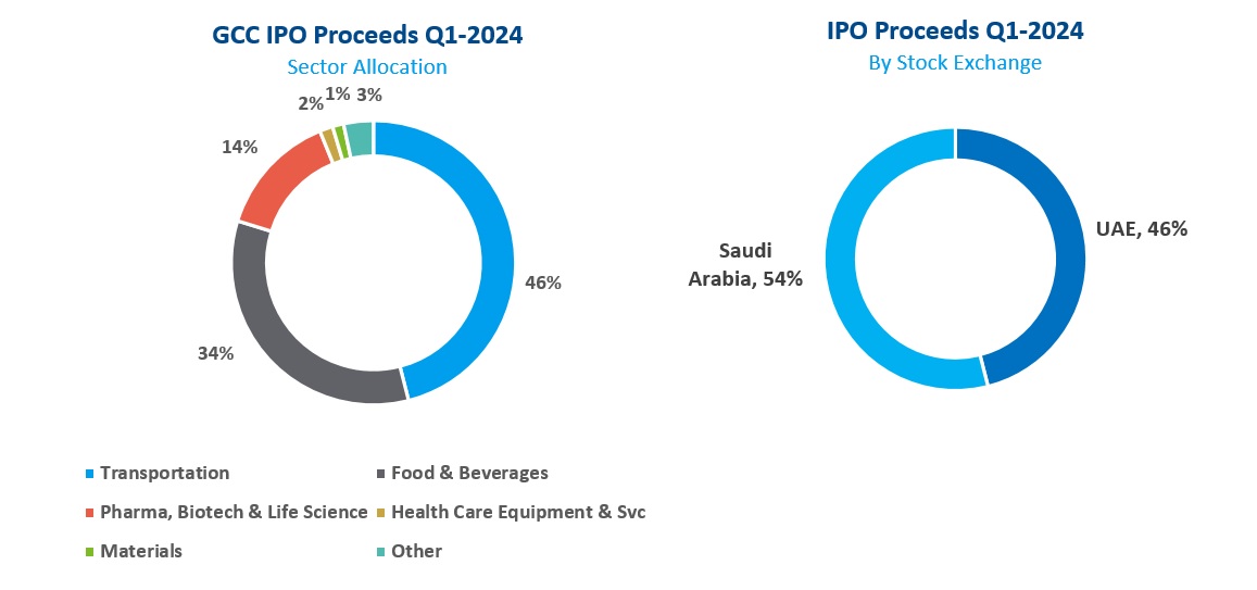 In Q1-24, the transportation sector led the way, representing nearly 46% of total proceeds. This was largely driven by Dubai-based Parkin Company's IPO, which raised $429 million, marking the largest offering of the period.